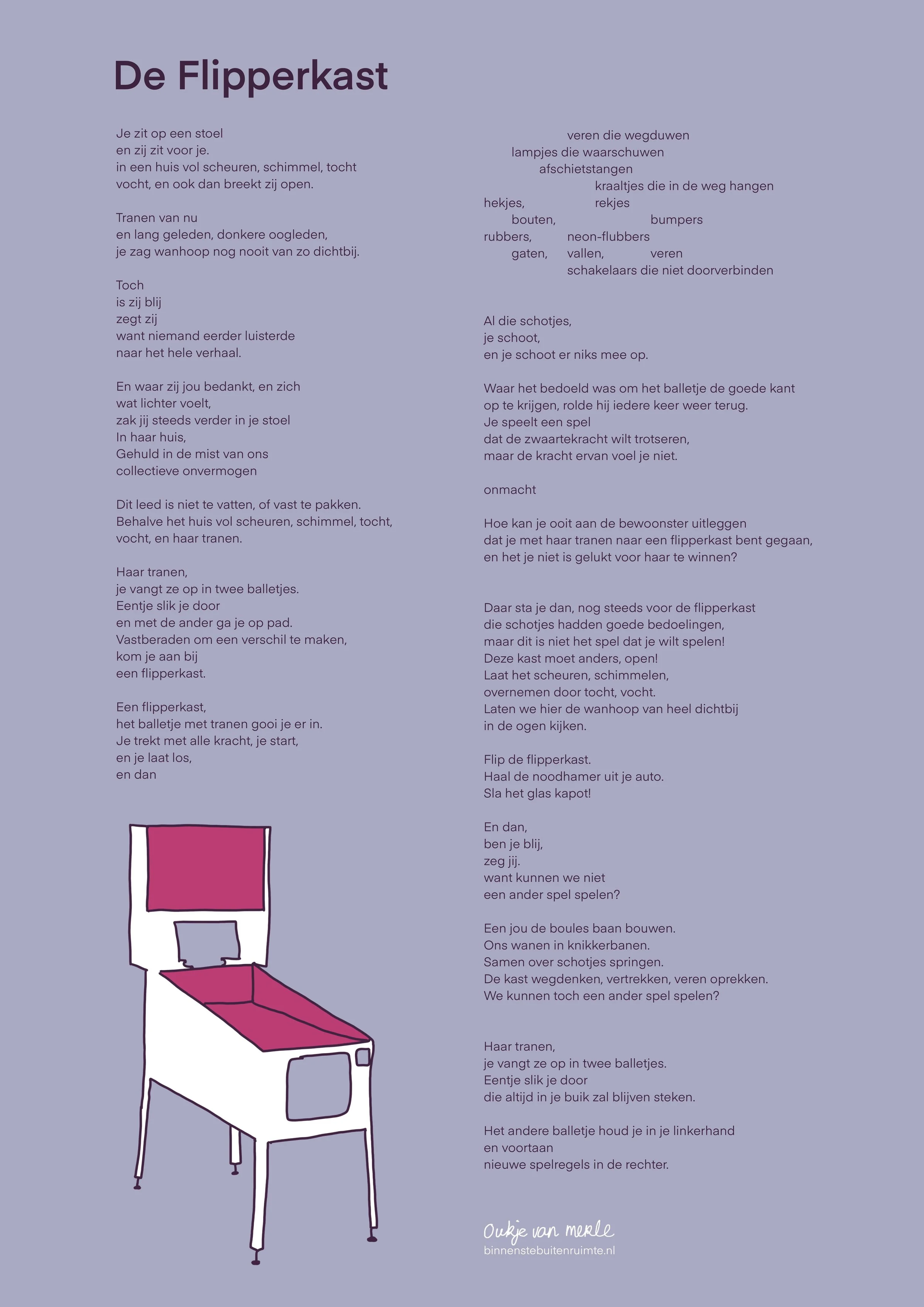 Een spoken word over je verantwoordelijk voelen naar een ander binnen je werk. Met daarbij gevoelens van onmacht, maar ook kracht, omdat je een verschil probeert te maken binnen een systeem dat daarin niet altijd meewerkt. De Flipperkast.