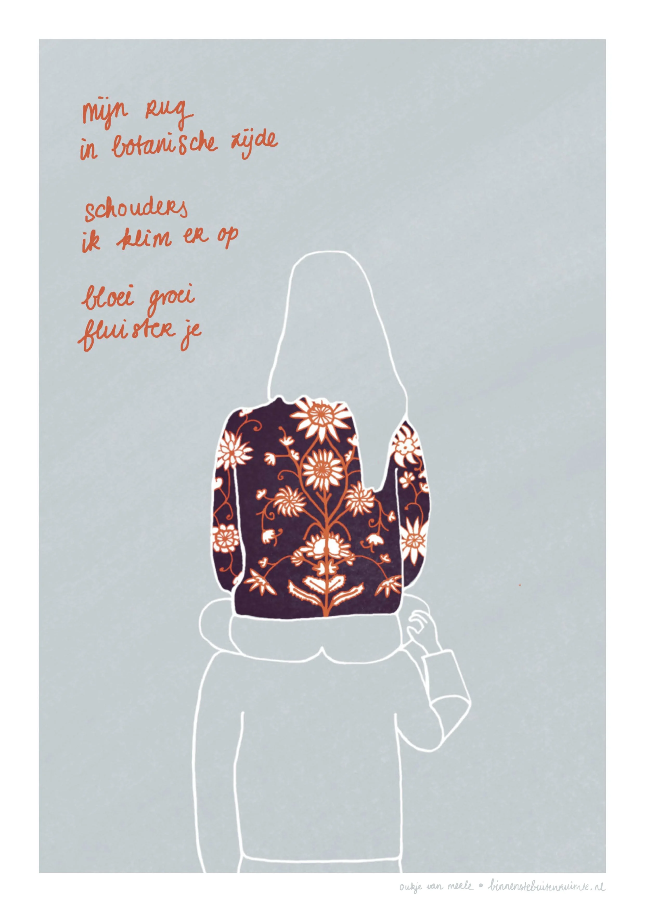 Mijn rug in botanische zijde. Schouders, ik klim er op. Bloei, groei, fluister je.